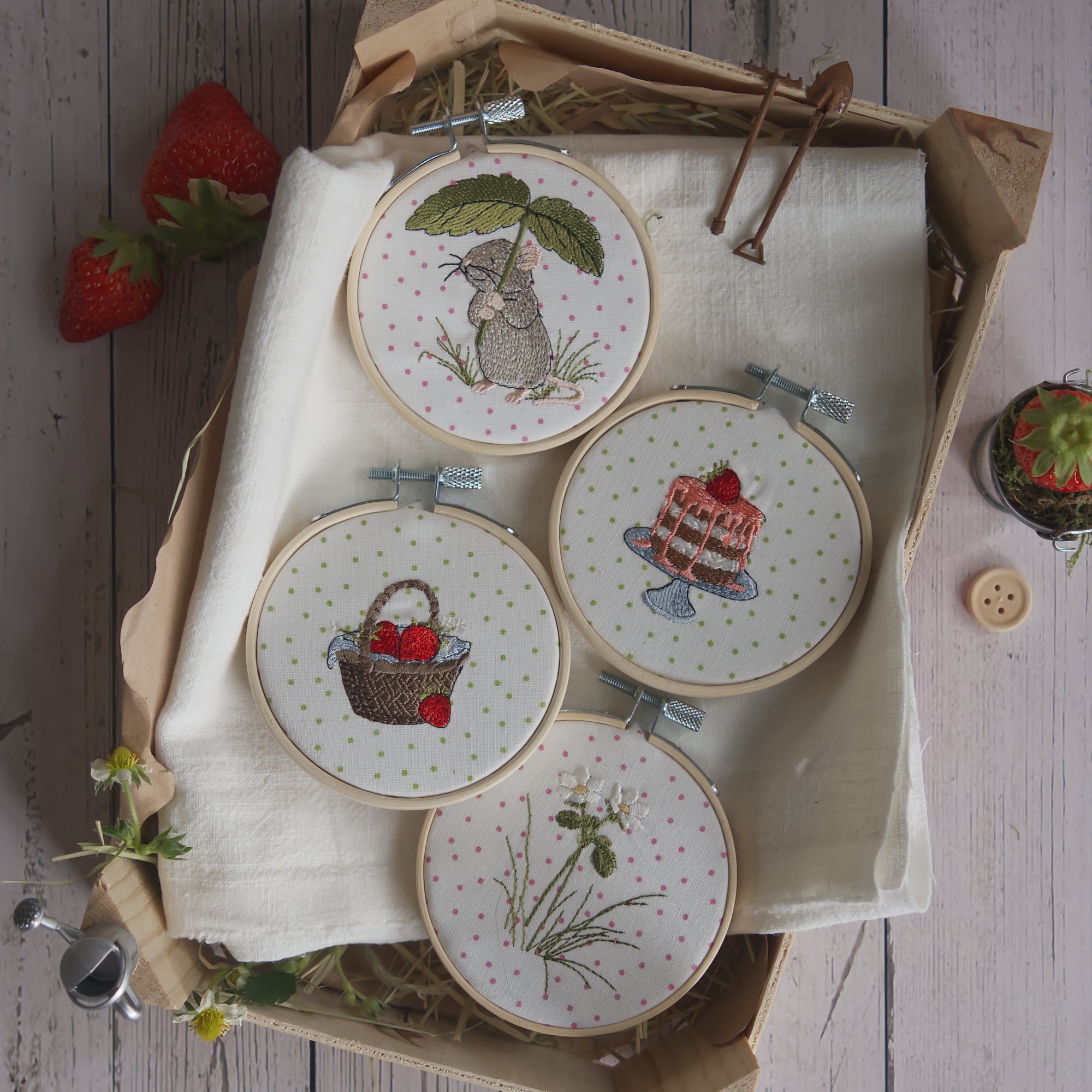Die Erdbeermäuse sind eine neue Serie liebevoller Stickmotive rund um Erdbeerpflanzen, Marmeladengläser und kleine Gartenabenteuer