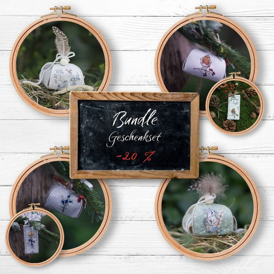 Stickdatei Geschenkset Box Wacholder, Rotkehlchen und Vergissmeinnicht mit Box und Anhänger ITH