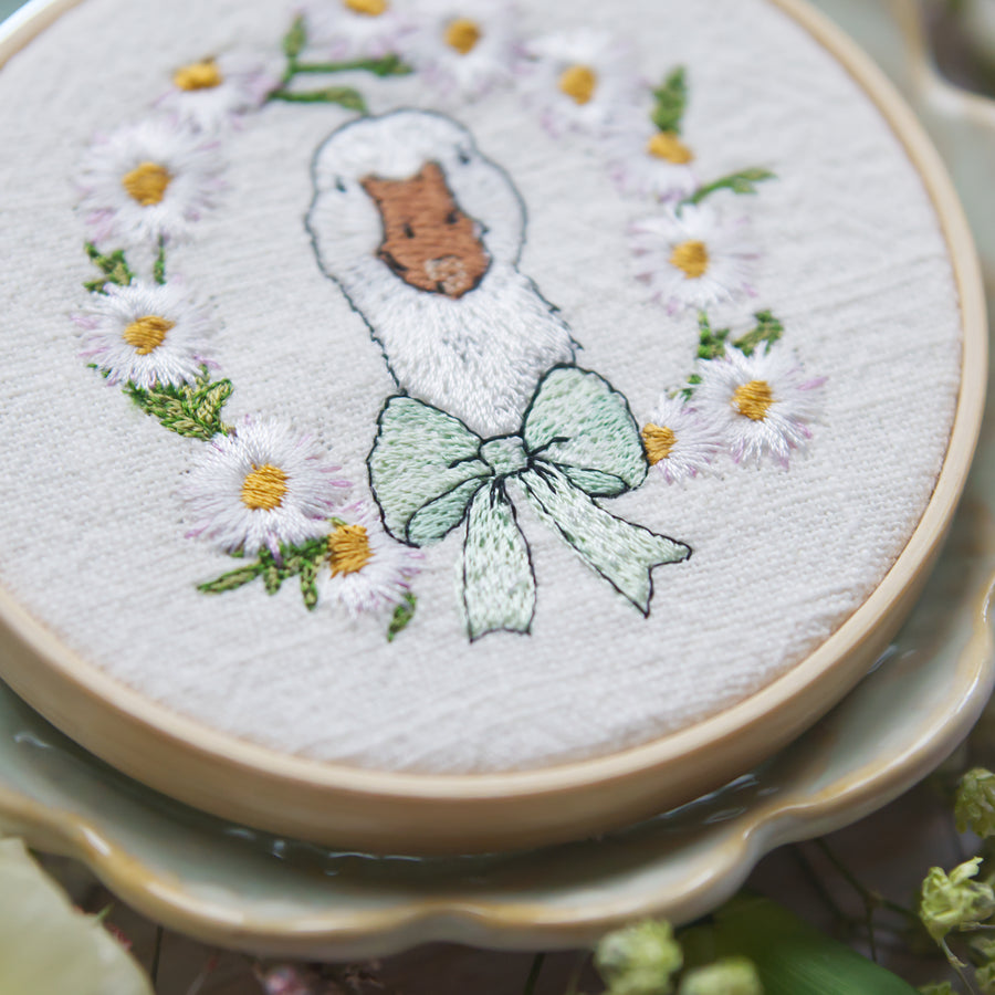 Mit dieser Stickdatei könnte eine feine Gans in diesem Jahr Deine Kaffeetafel z. B. auf Servietten oder Lichtbeuteln verzieren. Und sie kommt nicht allein, denn ein Hase und ein Schweinchen machen die Serie für eine abwechslungsreiche Platzierung auf dem Tisch und in der Küche rund.
