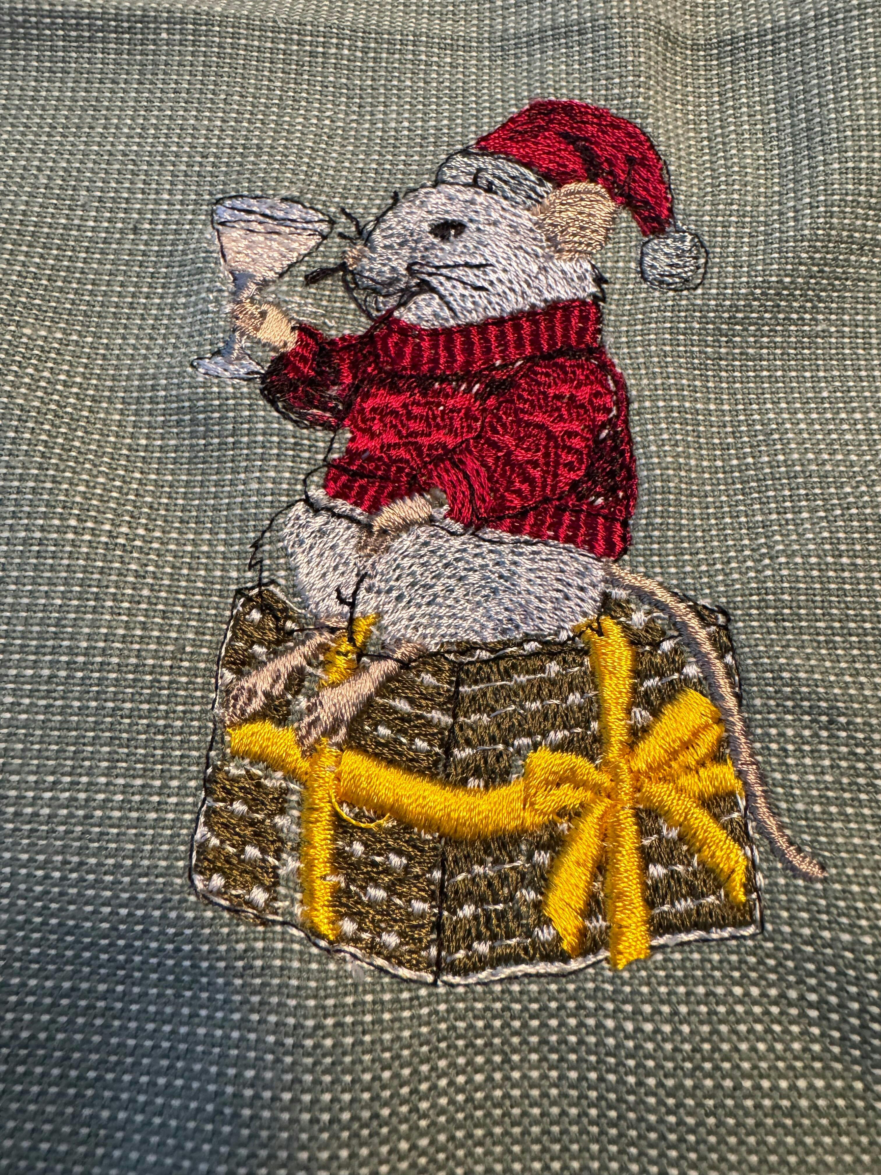 Stickdatei Jetzt wird gefeiert – Weihnachtliches Stickmuster Maus mit Geschenk & Glas • Fröhliche Stickdatei für Winter, Silvester & Deko