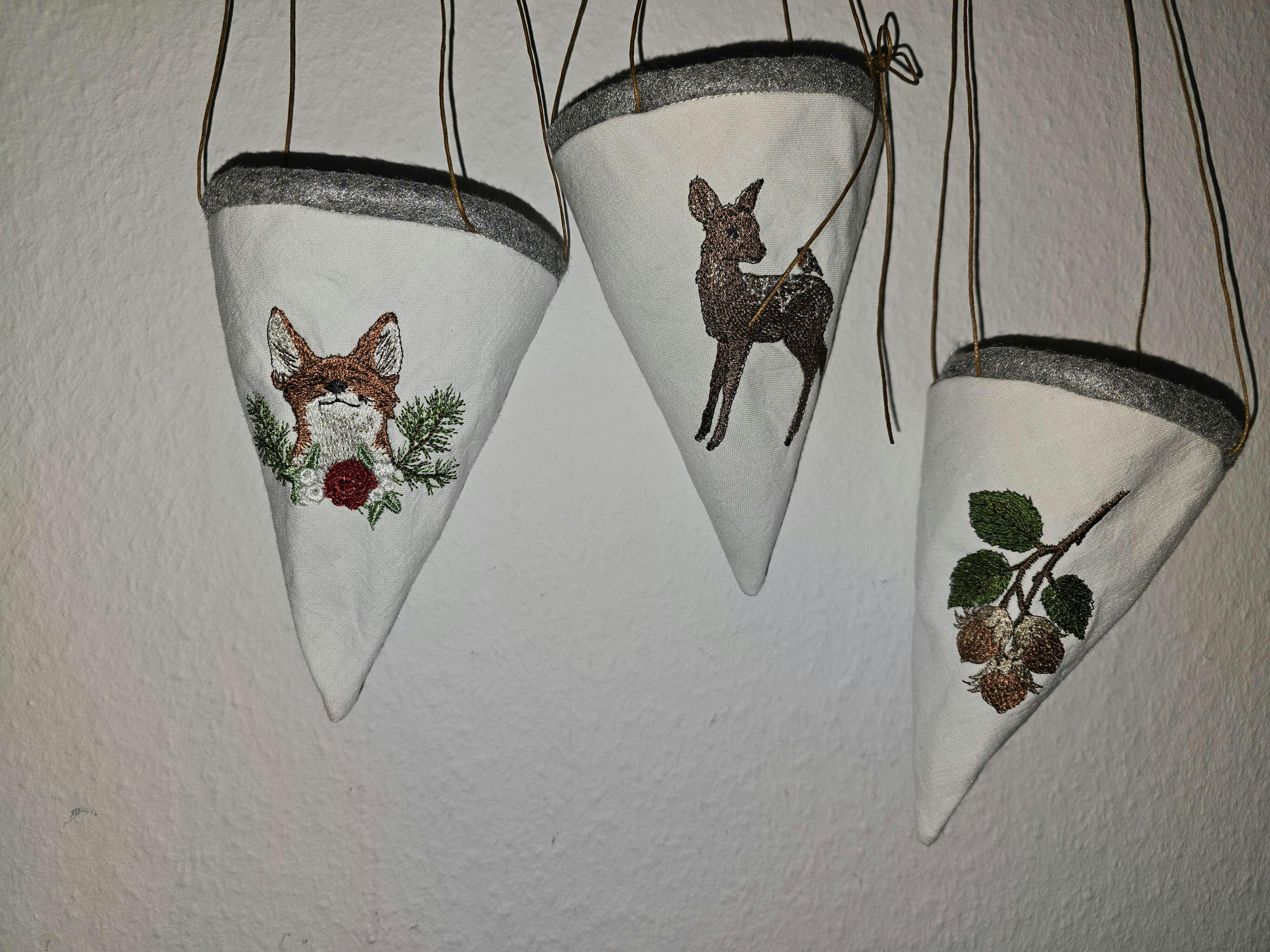Sticke Dir Deine behaglich, herbstliche Dekoration für ein Fenster oder zum Aufhängen an einen Ast. Befülle die Hängetöpfe mit allerlei Schönem, was Du bei Deinem Herbstspaziergang findest. Es eignen sich Moos, Kastanien, Nüsse, Laub, Federn oder vieles Andere was Dir gefällt. Auch als Mitbringsel für einen Besuch sind die Hängetöpfe gut geeignet. Du kannst einige der Dessins auch mit Fell verarbeiteten. Dafür eignet sich Kunstfell aus dem Fachhandel oder vielleicht auch ein Kissen oder eine Decke, die ausgedient haben, denn Du kommst mit sehr wenig Material aus. Mögliche andere Materialien für die Hängetöpfe sind Kunstleder, Leinen, Baumwollware. Lasse Deine Phantasie spielen! Außerdem benötigst Du etwas Schnur für das Aufhängeband und natürlich die üblichen Stickmaterialien wie Stickvlies, Garn, etc. Die Töpfe fertigen sich bis auf eine gerade Naht zum Schluss ausschließlich in der Stickmaschine. Das kleine Edelweiß im Geweih lässt sich für einen dreidimensionalen Effekt öffnen. Im Set enthalten sind vier verschiedene Dessins und das Wappen als Applikationsverarbeitung. Eine genaue bebilderte Anleitung für die Verarbeitung der ITH-Motive, der Applikation und der kleinen Blüte liegt den einzelnen Dateien bei.