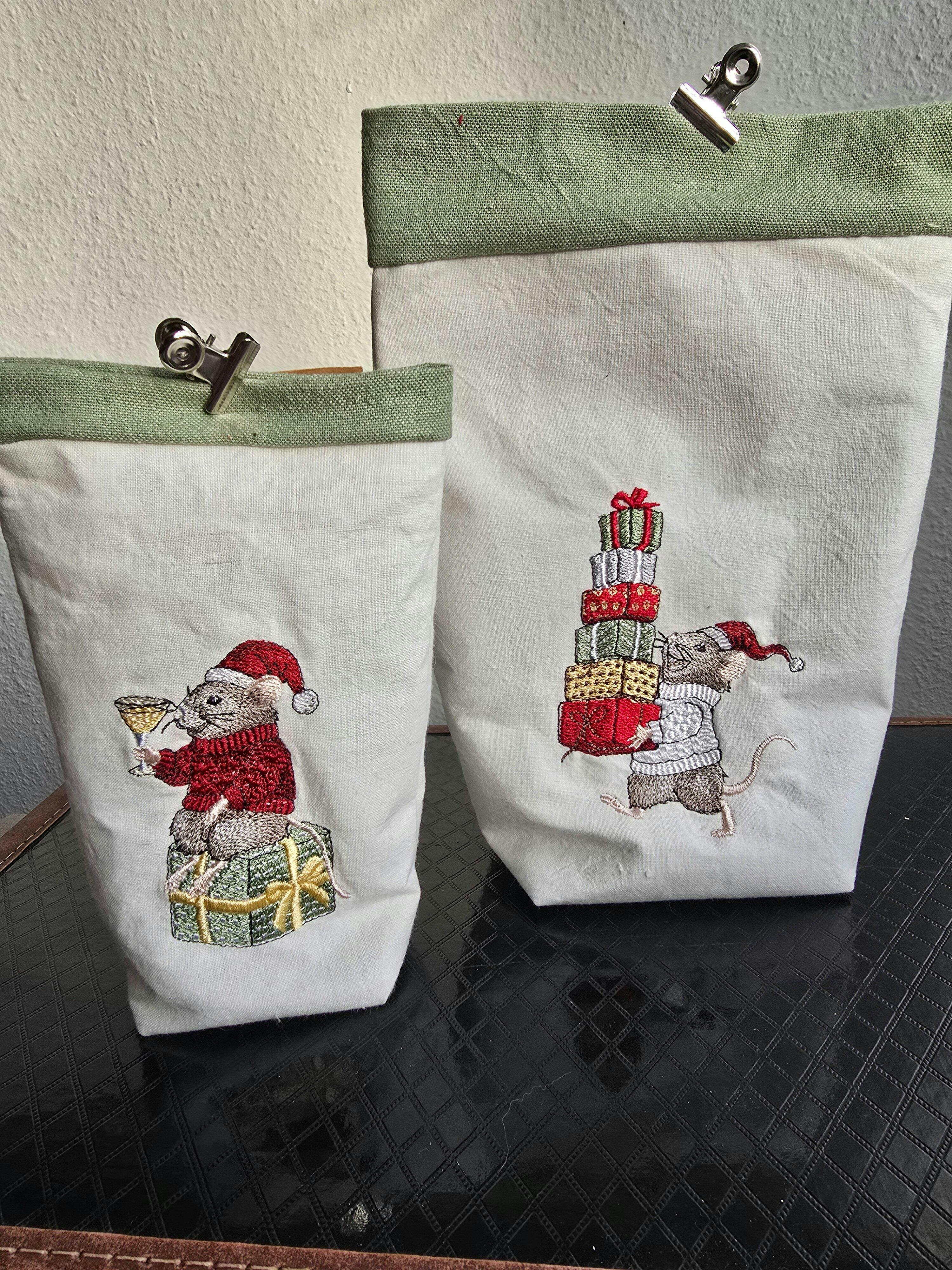 Stickdatei Jetzt wird gefeiert – Weihnachtliches Stickmuster Maus mit Geschenk & Glas • Fröhliche Stickdatei für Winter, Silvester & Deko
